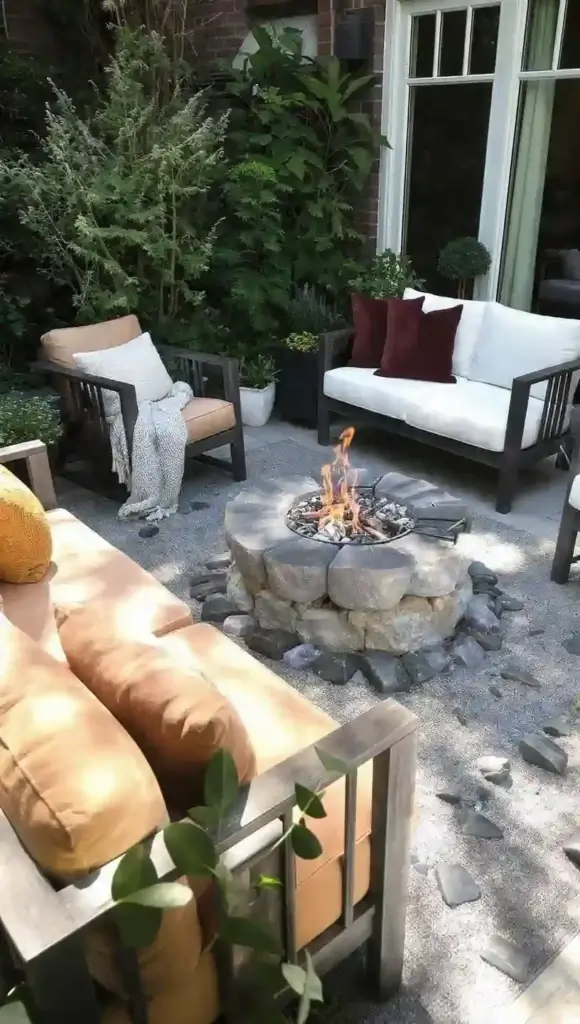 A cozy outdoor lounge featuring a fire pit is perfect for chilly nights and family gatherings. Opt for comfortable seating like outdoor sofas or chairs with plush cushions. Add a stone or metal fire pit in the center as the focal point. Surround the area with soft lighting and small plants for ambiance, and include some blankets or throws for added warmth.