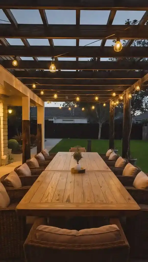 A dedicated dining area in your backyard allows for alfresco meals with the whole family. Include a large dining table, comfortable chairs, and shade (via umbrellas or pergolas) to keep everyone comfortable. Add string lights or lanterns to create a warm atmosphere for evening dining.