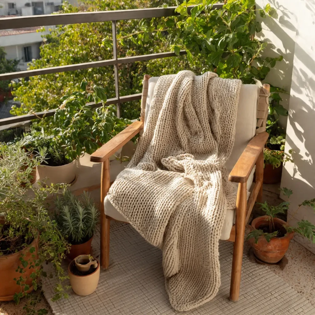 Blankets add comfort and make the balcony usable in cooler weather. They also give the space a soft, lived-in look.