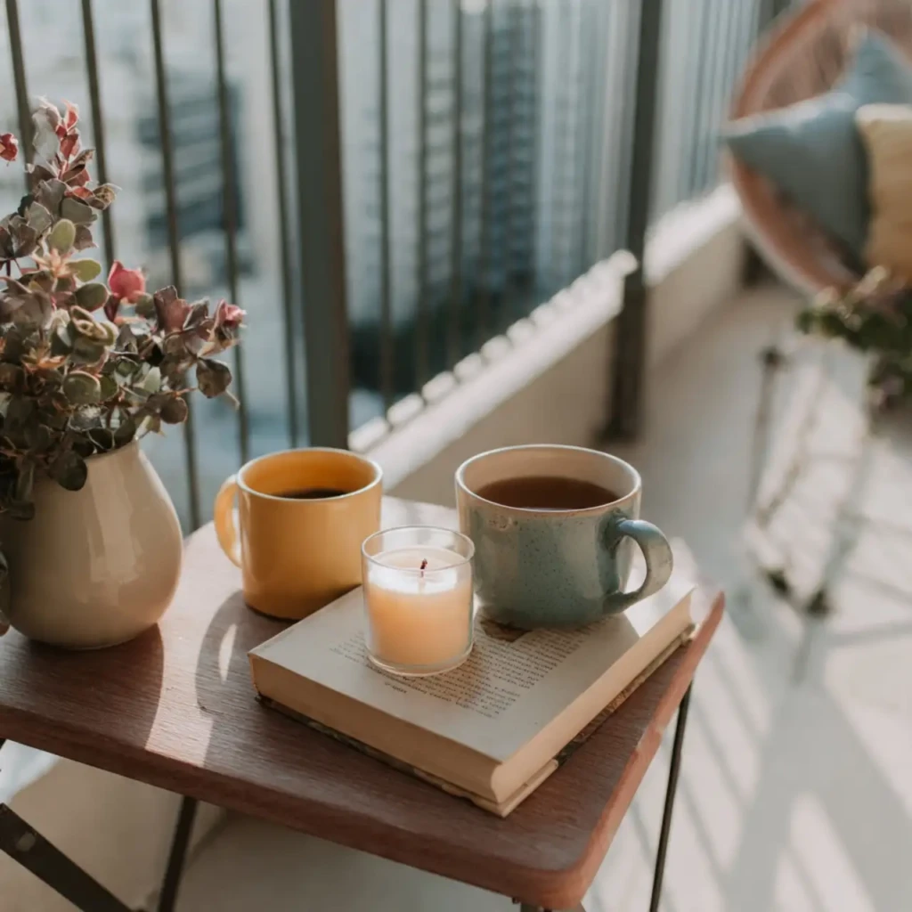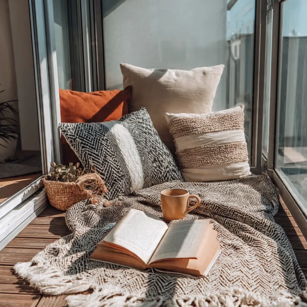 A cushion, blanket, and book can turn your balcony into a reading nook. It’s perfect for peaceful mornings or quiet evenings.