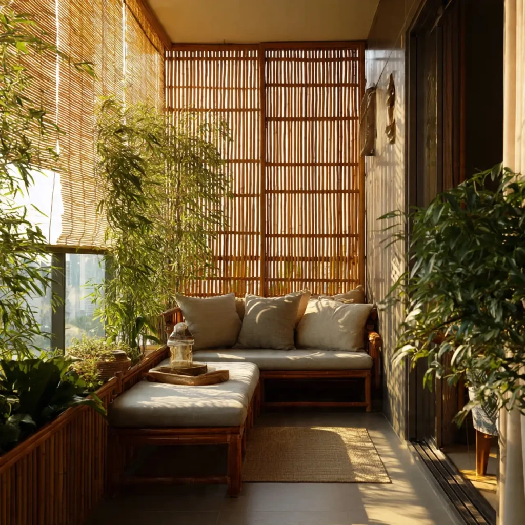 Bamboo screens or light curtains add privacy while keeping the space bright. They also make the balcony feel like a private retreat.