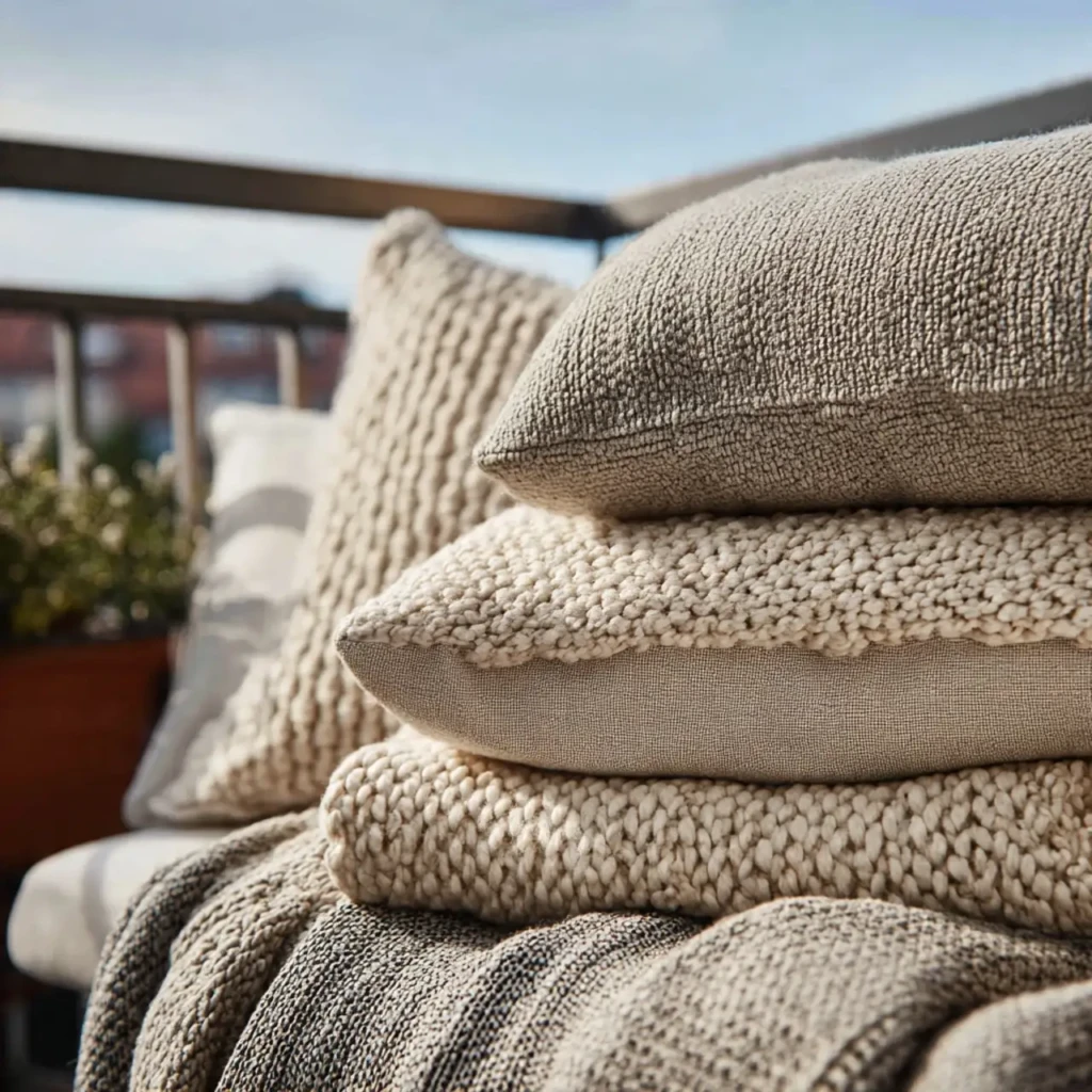 Textures like knit, linen, or cotton add depth to the space. These fabrics make the balcony feel warm and inviting.