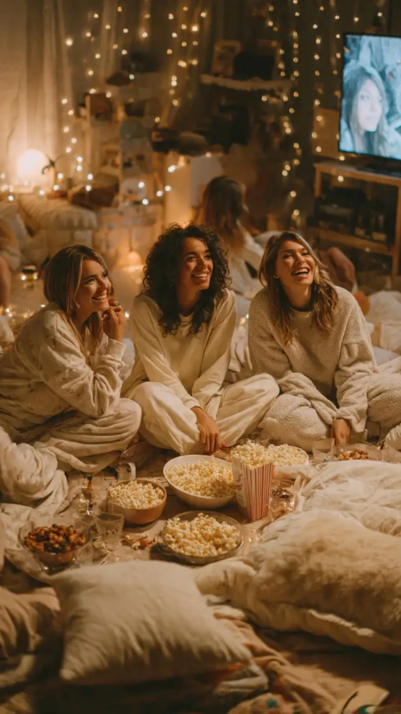 Throwback movie nights sleepover ko instantly fun bana deti hain. Old-school fashion, music aur storytelling ek alag hi charm create karti hai. Ye theme un groups ke liye best hai jo background mein movie chala kar baatein bhi karna chahte hain.
