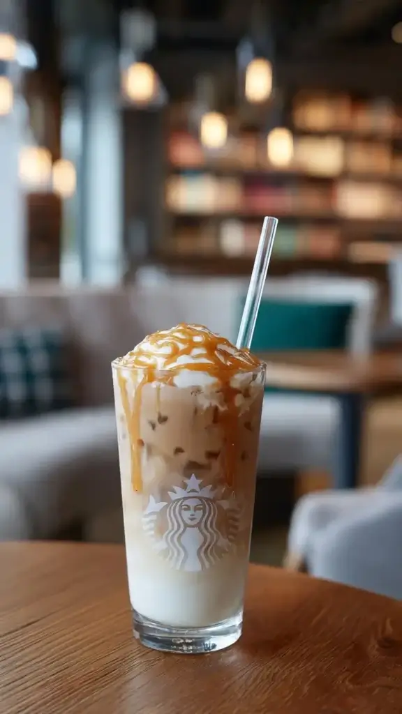 Iced Caramel Macchiato: “Design an image of an Iced Caramel Macchiato with a caramel drizzle on top, sitting on a wooden table with a straw and the Starbucks logo visible. The background should have a cozy café vibe with soft lighting.”